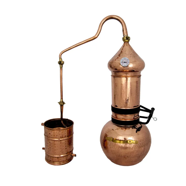 Аламбик изготовлен вручную из высококачественной меди. Медь обладает прекрасной теплопроводностью и обеспечивает равномерный прогрев содержимого куба. Она служит прекрасным катализатором сложных химических реакций в вине, не изменяя при этом вкуса и аромата напитков.