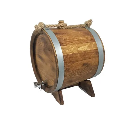 Баклага из дуба, емкость 8 литров, имеет форму усечённого конуса. Баклага часто используется для розлива напитков, поэтому снабжена краном, жестко крепится к подставке с разновеликими опорами так, чтобы вся жидкость могла вылиться из крана без дополнительных усилий. Для удобства переноски бочка снабжена ручкой, предназначена для приготовления, хранения, переноски и розлива вин и крепких напитков, а также пива, кваса, воды, соков, морсов. Баклага искусственно состарена, обработана воском. В комплекте: кран (металлический или деревянный), подставка, пробка.