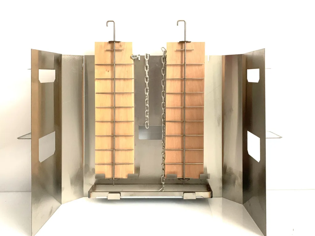 Поверх устанавливаются решетка, на которой разложены продукты. При готовке соки и жиры могут стекать в щепу, а получаемый в результате дым – впитываться в еду, поэтому применяется специальный поддон.
