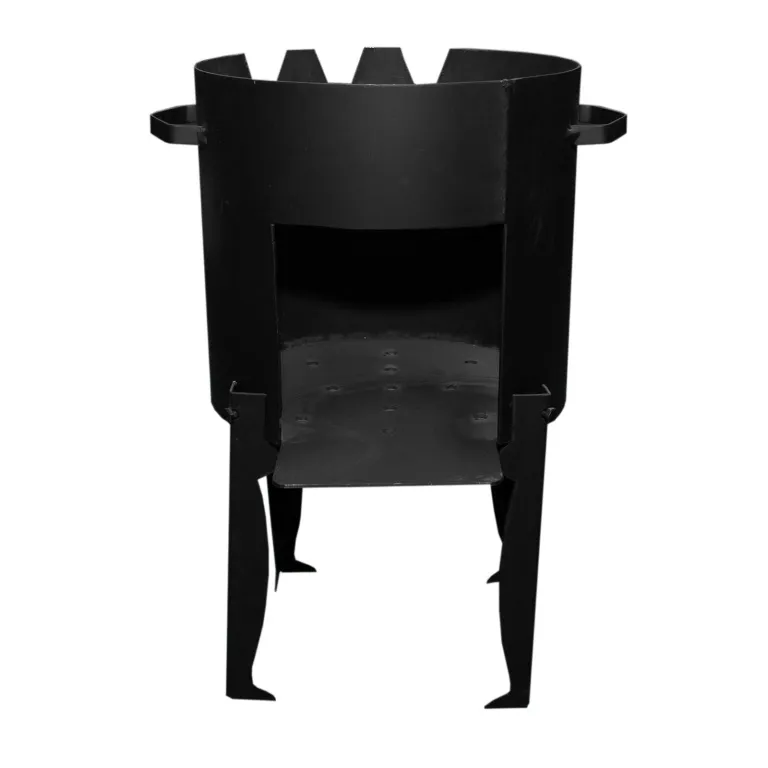 Компактная печь для казанов. Она предназначена для приготовлении пищи в казанах на открытом воздухе и очень проста в обращении. Рекомендуемое топливо - дрова. Имеется отверстие для выхода дыма с тыльной стороны печи.