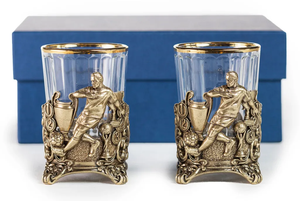 Изящные стопки «Футбол» 2 штуки в симпатичной коробке из дизайнерского картона – отличный тематический подарок футболисту. Особенность стопок заключается в декоративном оформлении из латуни, выполненном в технике художественного литья. В центре композиции изображён футболист, отбивающий мяч. А за его спиной в подтверждение спортивных достижений – кубки, пьедестал