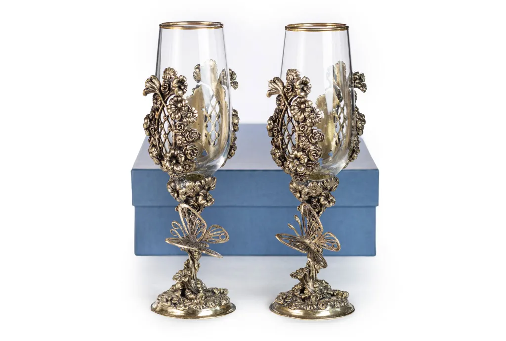 Изысканный набор из двух бокалов для шампанского. Хороший подарок для утонченных личностей, ценящих эстетическую красоту. В этих бокалах наши дизайнеры воплотили всю свою фантазию, создав все цветы и бабочки вручную. Бокалы "Бабочки" упакованы в красивую дизайнерскую коробку.