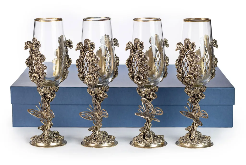 Четыре бокала для шампанского «Бабочки» – роскошный подарок для романтичной натуры и любителя предметов искусства. Можно бесконечно наслаждаться пышным декором латунной ножки – здесь изображена бабочка с ажурными крылышками, а декоративные накладки на стенках бокала и основание усыпаны красивыми цветами.
