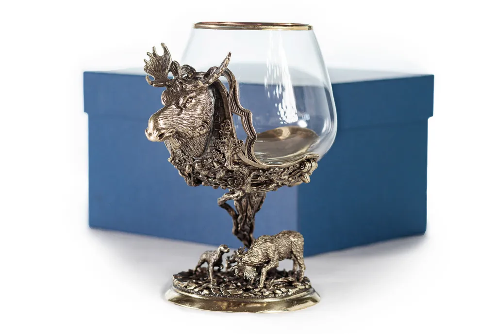 Стеклянный бокал для коньяка «Русский лес» (лось) украшен латунной ножкой ручной работы, на основании которой изображена сцена охоты – охотничий пёс травит лося. Ножка отлита в виде ствола дерева, крона которого обхватывает низ снифтера. На фоне резных листьев выделяется трофейная голова лося. Бокал упакован в синюю коробку из дизайнерского картона.