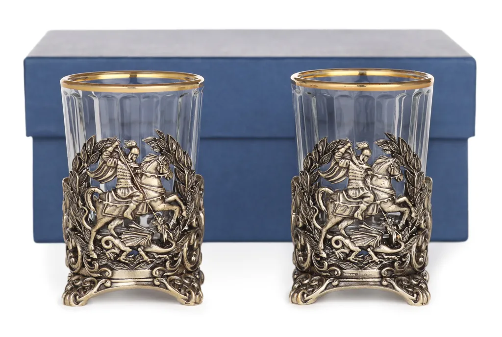 Две стопки «Георгий Победоносец» в латунном обрамлении – это изысканный предмет интерьера, выполненный в технике художественного литья. Их элегантный дизайн и высокое качество материалов делают их идеальным дополнением к любому столу или бару. Великолепное исполнение и утонченность каждой детали делают эти стопки по-настоящему уникальными и привлекательными.