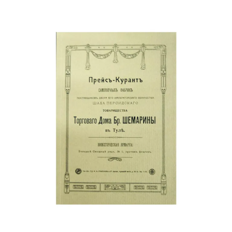 В каталоге показано 128 разновидностей самоваров производства фабрик Братьев Шемариных, с указанием размера, веса и емкости. В дополнение к репринтному воспроизведению настоящего прейс-куранта, даются, известные на сегодняшний день, оригинальные клейма производителя. Используя настоящий прейс-курант как справочник, можно с большой долей вероятности определить подлинность самоваров фабрик Бр. Шемариных.
