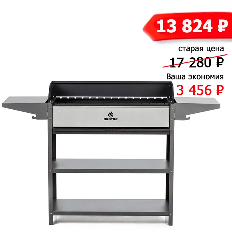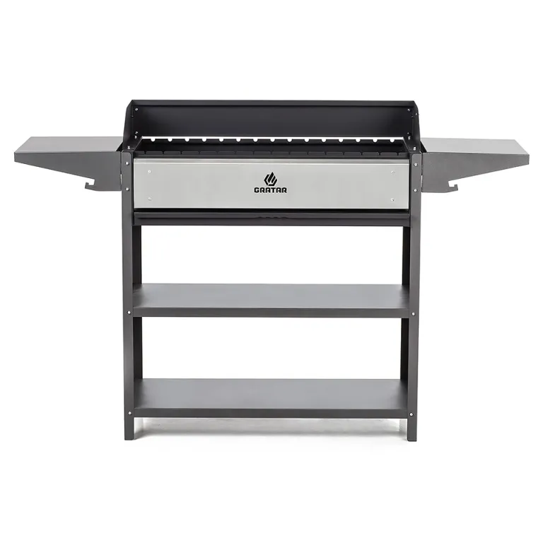 Вместительный гриль-мангал с ветрозащитой. Топка с декоративной накладкой из нержавеющей стали и выдвижным зольником для регулировки интенсивности жара.