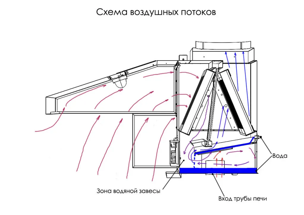 - Четырехслойная водяная завеса дополнительно охлаждает дым, осаждает сажу, золу, жир и деготь.