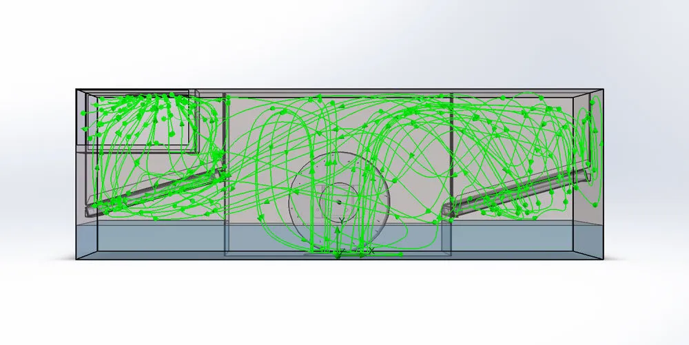 - Разворот потока на 180 градусов над водой и резкая потеря скорости дымовых газов осаждает потухшие искры, золу и сажу в воде за счёт инерции.