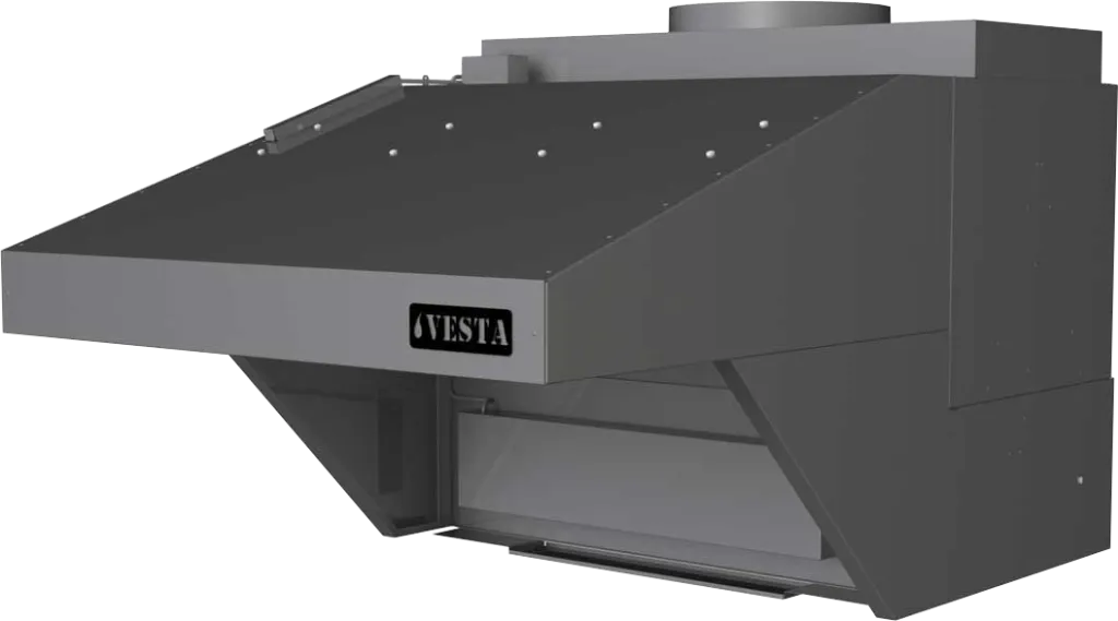 Совмещенный с искрогасителем вытяжной зонт укомплектован лабиринтными жировыми фильтрами из нержавеющей стали.