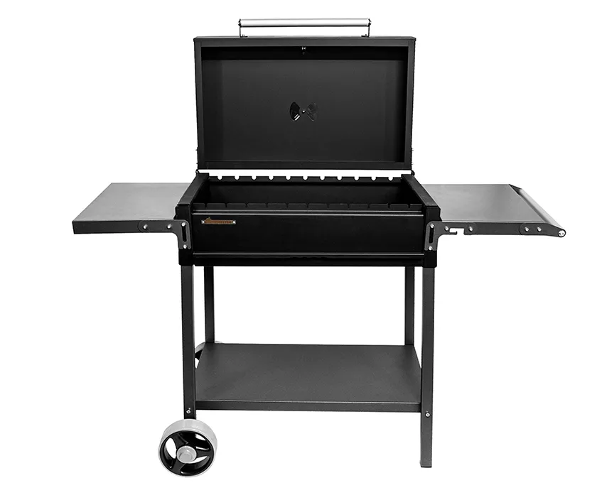 Функциональный гриль-мангал из толстой стали со складными полками и крышкой барбекю. Крышка оборудована термометром и заслонкой для регулировки притока воздуха, а в основании топки устроен выдвижной зольник. Выдерживает дровяную растопку