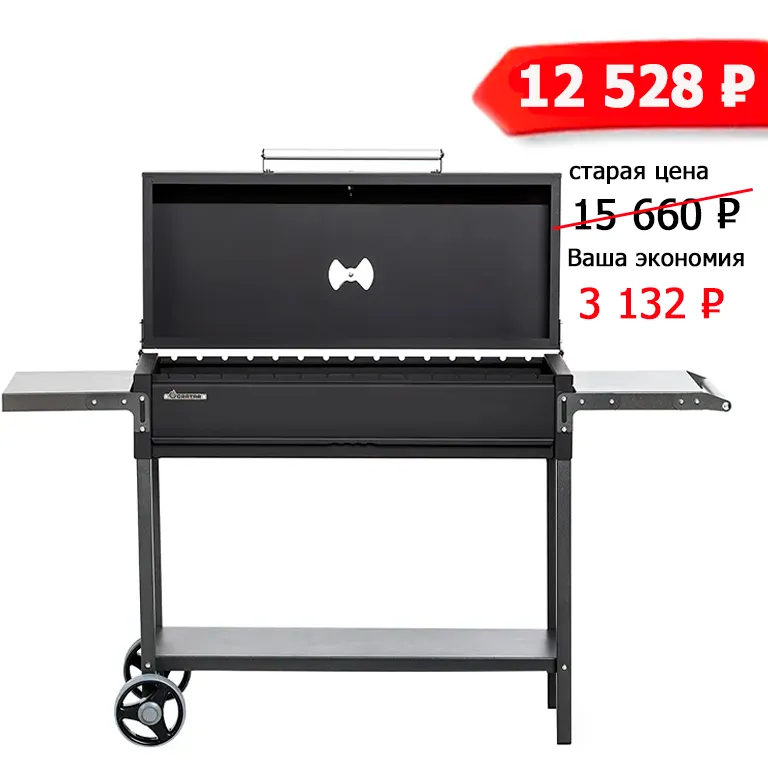 Функциональный гриль-мангал из толстой стали со складными полками и крышкой барбекю. Крышка оборудована термометром и заслонкой для регулировки притока воздуха, а в основании топки устроен выдвижной зольник.