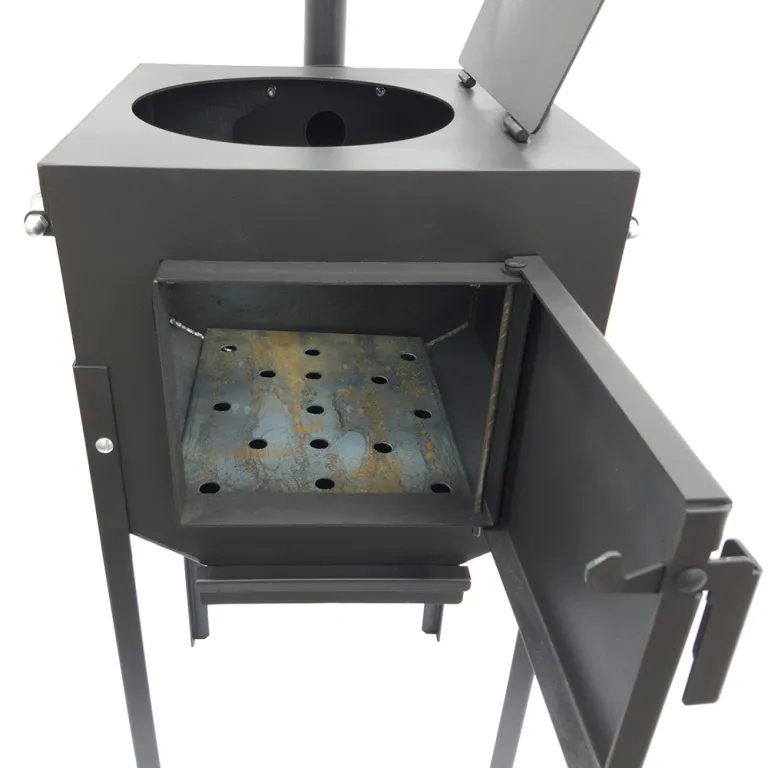 Съемные ножки и съёмная труба позволяет легко перевозить печь в машине. Сталь 3 мм. обеспечивает длительный срок эксплуатации. Покрашена термостойкой эмалью (до 900 гр.С)