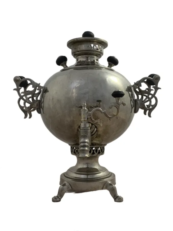 Цена на товар может измениться после поступления товара. Точную цену уточняйте у нашего менеджера. Телефон: 8 (812) 336-25-25Самовар Шар с витыми ручками, 5 литров, не клейменый, восстановлен, начало ХХ века, никель, белый, труба 58 мм