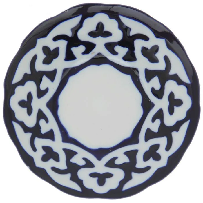 Небольшая узбекская тарелка из коллекции посуды "Пахта". Тарелка изготовлена на посудном заводе, может использоваться как дома, так и для сервировки блюд в ресторанах с восточной едой. Подходит для вторых блюд, порций салатов и т.п.