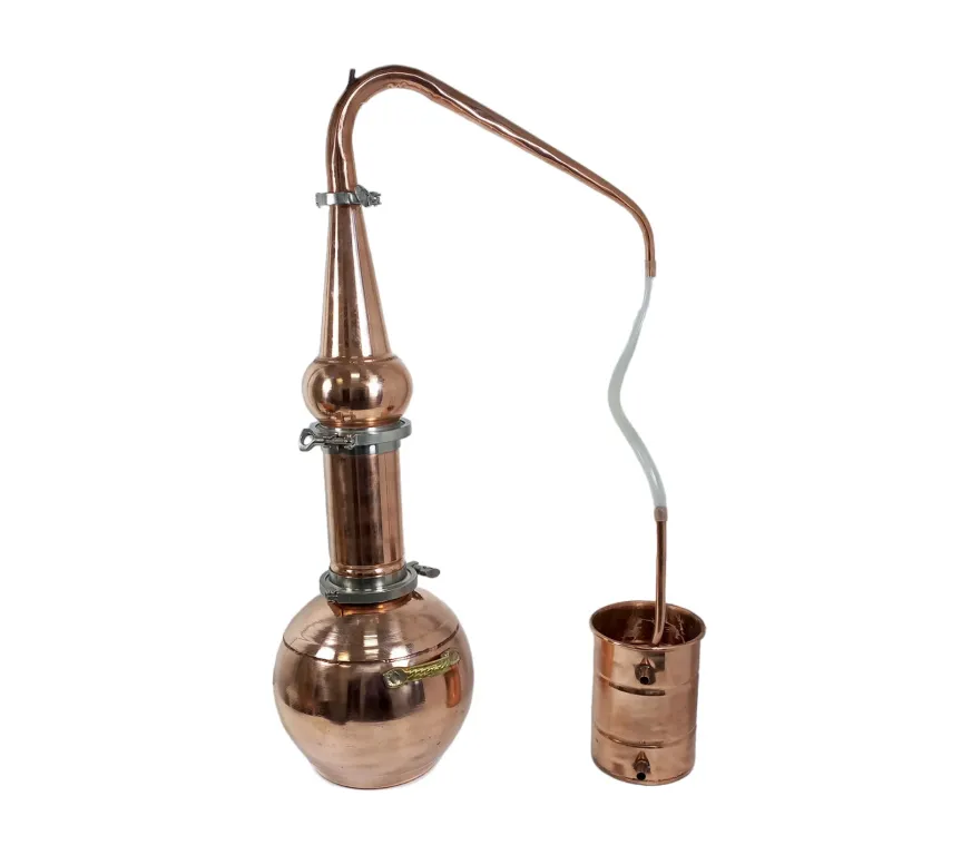 Аламбик – это уникальный дистиллятор, позволяющий получить, путем перегонки исходного сырья, алкогольный продукт высочайшего качества. Это могут быть кальвадос, абсент, виски и т.д. Основное преимущество аламбика - это медь, из которого он изготовлен. Медь абсорбирует оксид серы, выделяемый в процессе брожения и, тем самым, исключает присутствие нежелательного запаха и неприятного привкуса в конечном продукте. Медь является классическим металлом в коньячной и вискарной промышленности за рубежом. При перегонке медь насыщает напиток ионами, благодаря которым выдерживание в дубовых бочках ускоряется, так же полностью раскрывается вкус напитка.