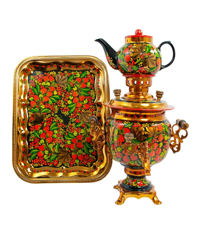 Самовар электрический 3 л в наборе, Хохлома, Клубника с ежевикой на черном фоне, овал
