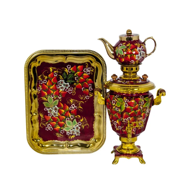 Самовар электрический 3 л в наборе, Клубнички на красном фоне, конус