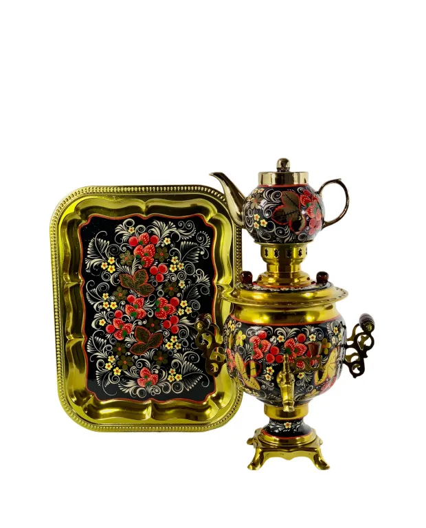 Самовар электрический 3 л в наборе, Клубничная поляна на черном фоне, овал