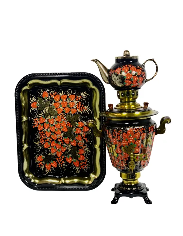Самовар электрический 3 л в наборе, Клубничная ветка на черном фоне, конус