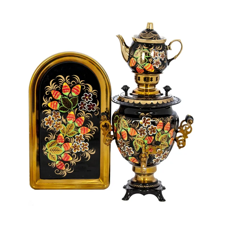 Самовар электрический 3 л в наборе, Клубника на черном фоне, желудь