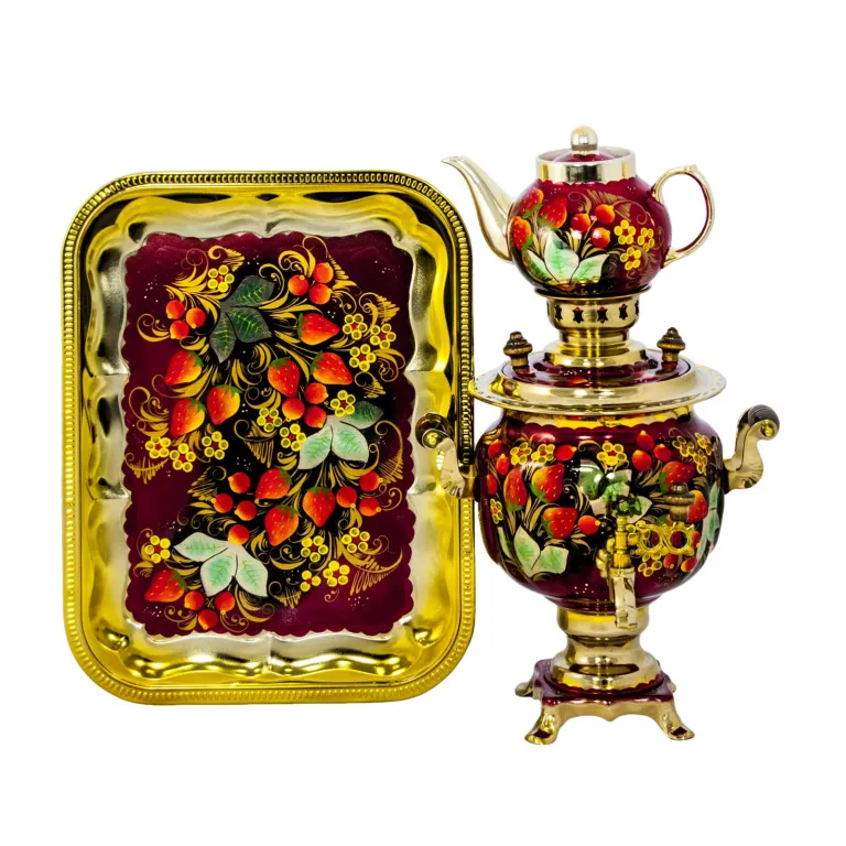 Самовар электрический 3 л в наборе, Клубника с желтыми цветочками на красном фоне, овал