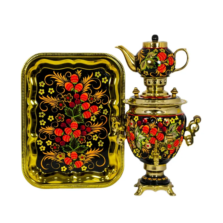 Самовар электрический 3 л в наборе, Клубника с желтыми цветочками, оранжевые узоры на черном фоне, желудь