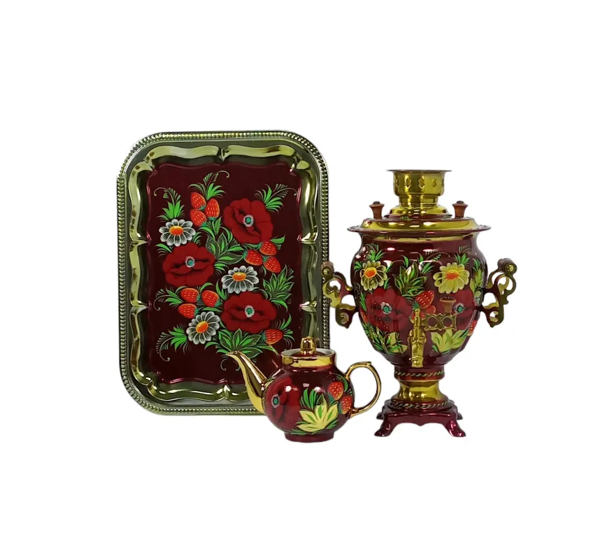 Самовар электрический 3 л в наборе, Маки с ромашками на красном фоне, желудь