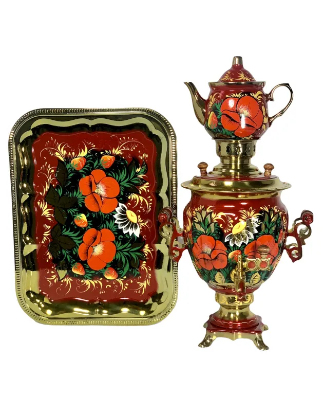 Самовар электрический 3 л в наборе, Маки с ромашкой на красном фоне, желудь