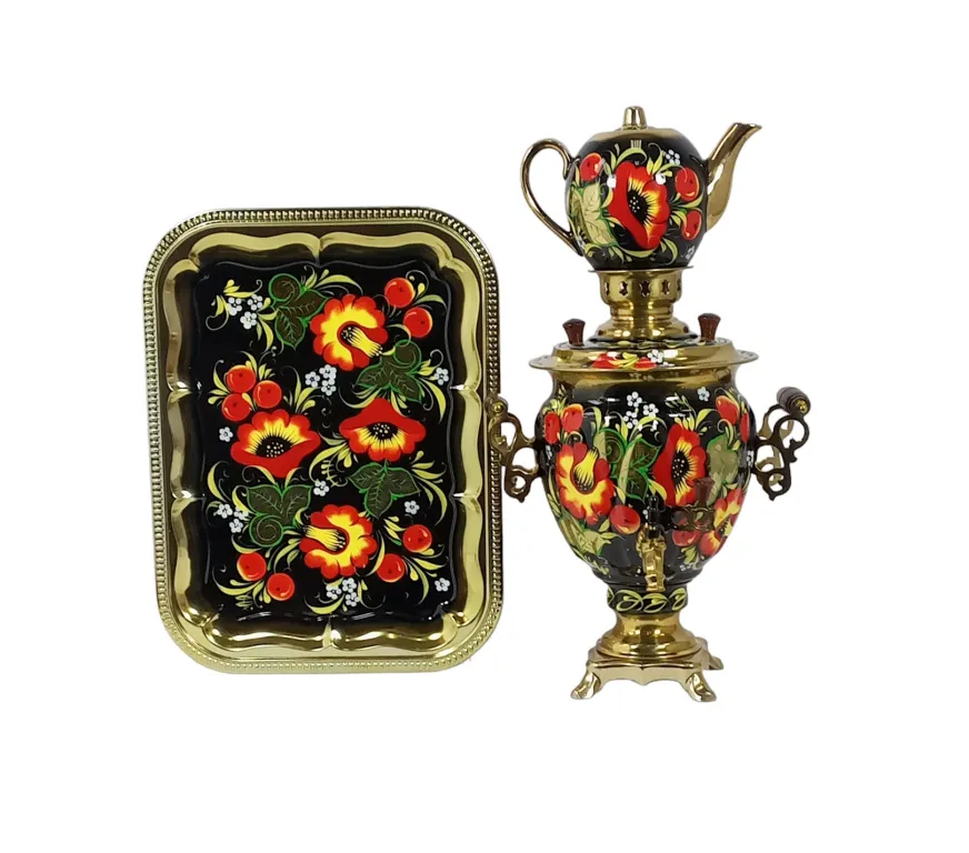 Самовар электрический 3 л в наборе, Маки с яблоками на черном фоне, желудь