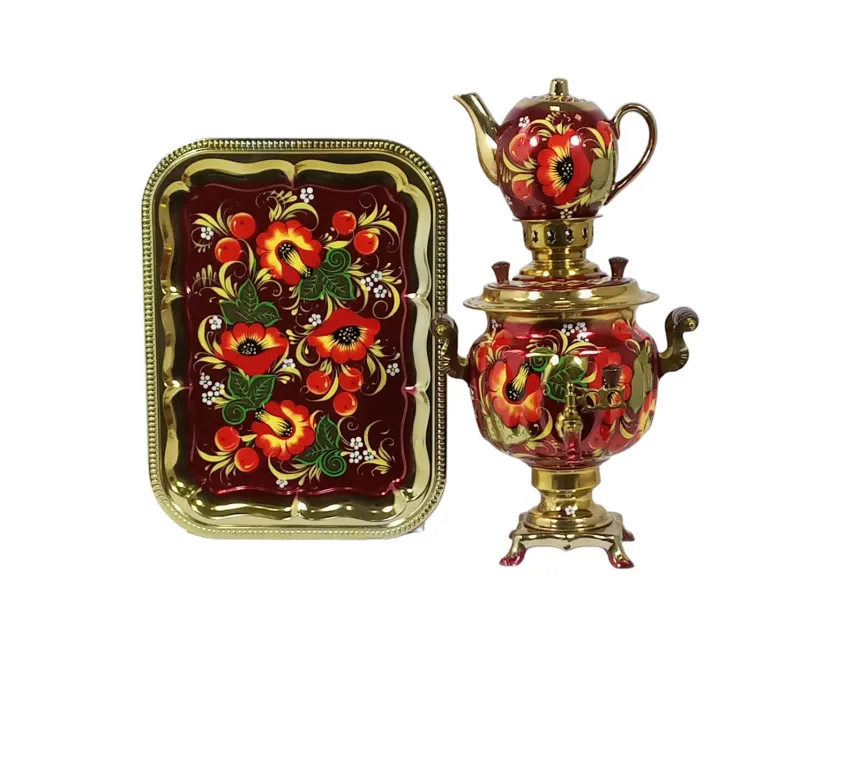 Самовар электрический 3 л в наборе, Маки с яблоками на красном фоне, овал