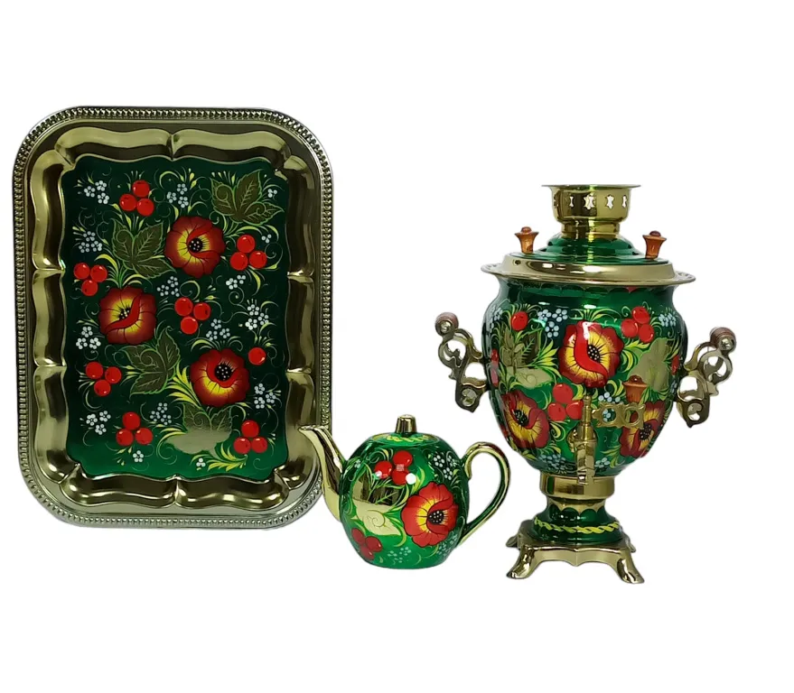 Самовар электрический 3 л в наборе, Маки с яблоками на зеленом фоне, желудь