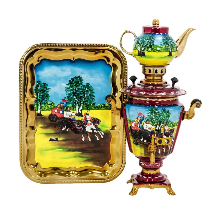 Самовар электрический 3 л в наборе, Тройка летняя на красном фоне, конус