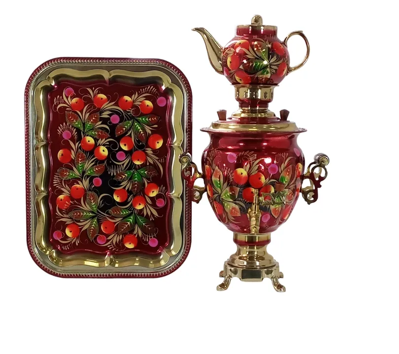 Самовар электрический 3 л в наборе, Яблоки на красном фоне, желудь