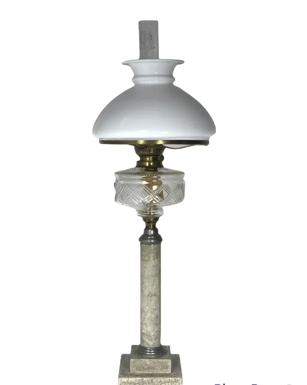 Цена на товар может измениться после поступления товара. Точную цену уточняйте у нашего менеджера. Телефон: 8 (812) 336-25-25Керосинова лампа Царская, с плафоном на мраморной ножке с основанием и стеклянной (прозрачной) емкостью для керосина, начало ХХ века, восстановлен