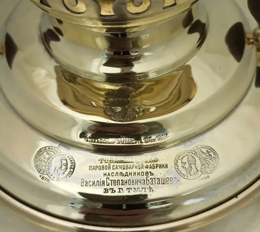 Цена на товар может измениться после поступления товара. Точную цену уточняйте у нашего менеджера. Телефон: 8 (812) 336-25-25Самовар Дуля (груша) долями, 5,5 литров, Товарищество Паровой Самоварной фабрики наследников Василия Степановича Баташева въ Туле, конец 19 начало 20 века, восстановлен, латунь, желтый, труба 64 мм