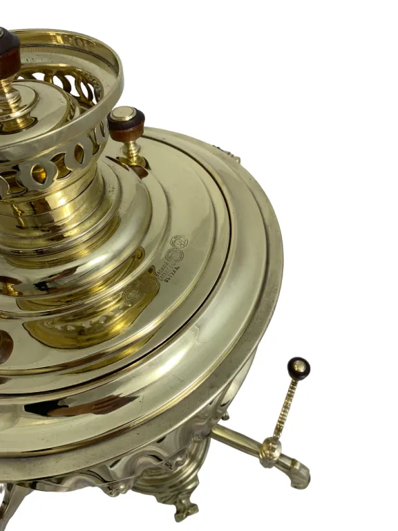 Цена на товар может измениться после поступления товара. Точную цену уточняйте у нашего менеджера. Телефон: 8 (812) 336-25-25Самовар Рюмка с "косичками", 9,5 литров, Василiй Баташевъ въ Туле, восстановлен. конец 19 начало 20 века, латунь, желтый, труба 71 мм