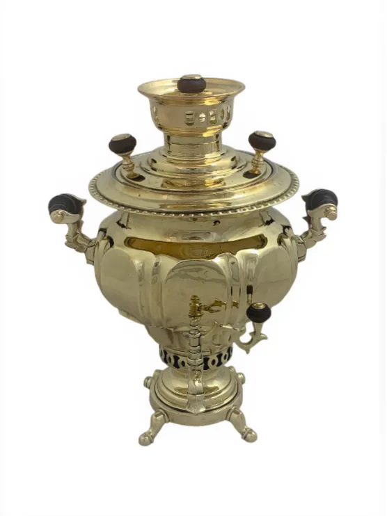 Цена на товар может измениться после поступления товара. Точную цену уточняйте у нашего менеджера. Телефон: 8 (812) 336-25-25Самовар Ваза "ложчатая" долями, 3,5 литра, Товарищество Торгового Дома братьев Шемариных въ Туле, конец 19 начало 20 века, восстановлен, латунь, желтый, труба 58 мм