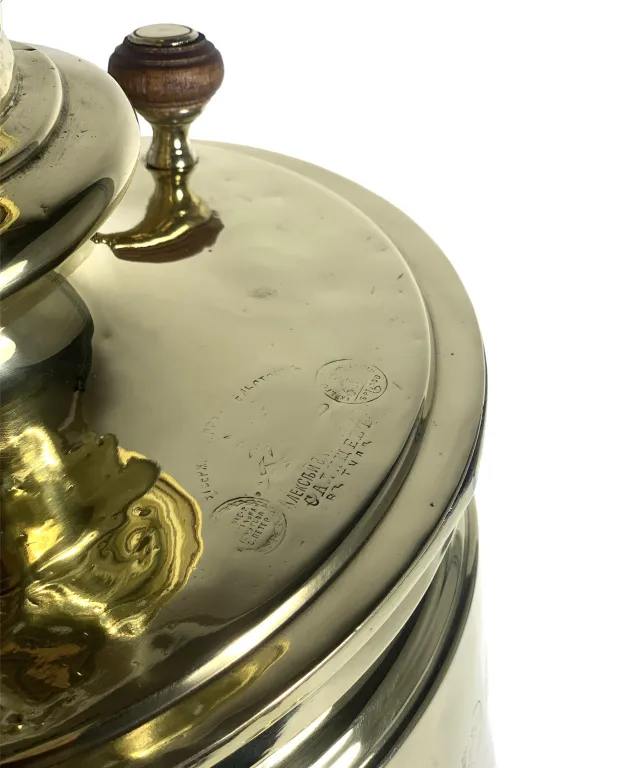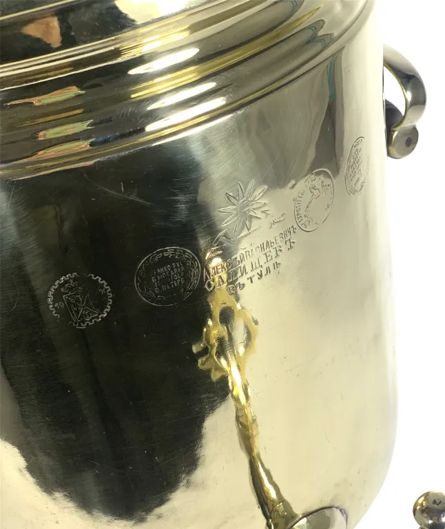 Цена на товар может измениться после поступления товара. Точную цену уточняйте у нашего менеджера. Телефон: 8 (812) 336-25-25УТ 10329 Самовар Банка медальная с висячими ручками, 11 литров, Алексей Васильевичъ Салищев в Туле, конец 19 начало 20 века, восстановлен, латунь, желтый, труба 79 мм