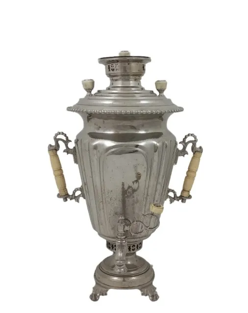 Цена на товар может измениться после поступления товара. Точную цену уточняйте у нашего менеджера. Телефон: 8 (812) 336-25-25Самовар Рюмка с "цыганскими" и костяными ручками, Товарищество Паровой Самоварной фабрикинаследников Василия Степановича Баташева въ Туле, конец 19 начало 20 века, восстановен, 6 литров, никель, белый, труба 64 мм