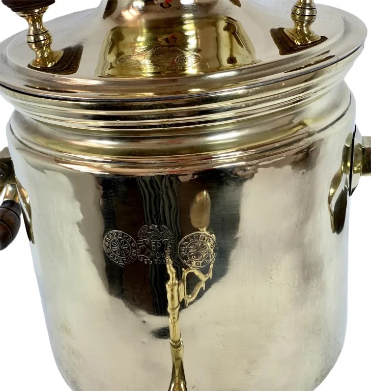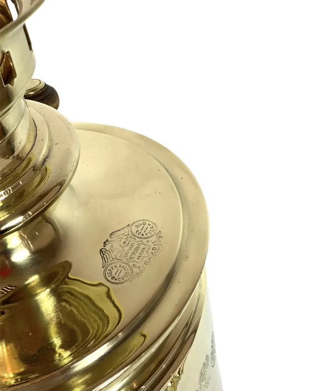 Цена на товар может измениться после поступления товара. Точную цену уточняйте у нашего менеджера. Телефон: 8 (812) 336-25-25Самовар Банка медальная с висячими ручками, 4 литра, фабрика братьев Петровыхъ в Туле, конец 19 века, восстановлен, латунь, желтый, труба 64 мм