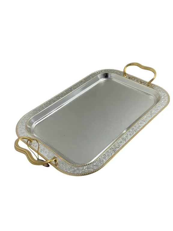 Цена на товар может измениться после поступления товара. Точную цену уточняйте у нашего менеджера. Телефон: 8 (812) 336-25-25Поднос сервировочный с ручками, 345х245 мм, Rasti, никелированный с золотой каемкой, холодная штамповка, гравировка, никель, белый, новый