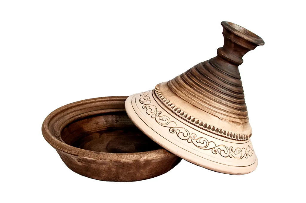 Марокканская посуда тажин также используется для приготовления блюд из мяса, овощей, рыбы и блюд из других ингредиентов. Тажин состоит из чаши и конусовидного колпака, который устанавливается на чашу. Силуэт тажина напоминает тандыры, знаменитые восточные печи. В процессе приготовления влага из продуктов испаряется и конденсируется на стенках крышки, после чего стекает вниз. Таким образом сохраняется сок продуктов и аромат специй, поэтому блюда получаются сочными, нежными и невероятно ароматными.