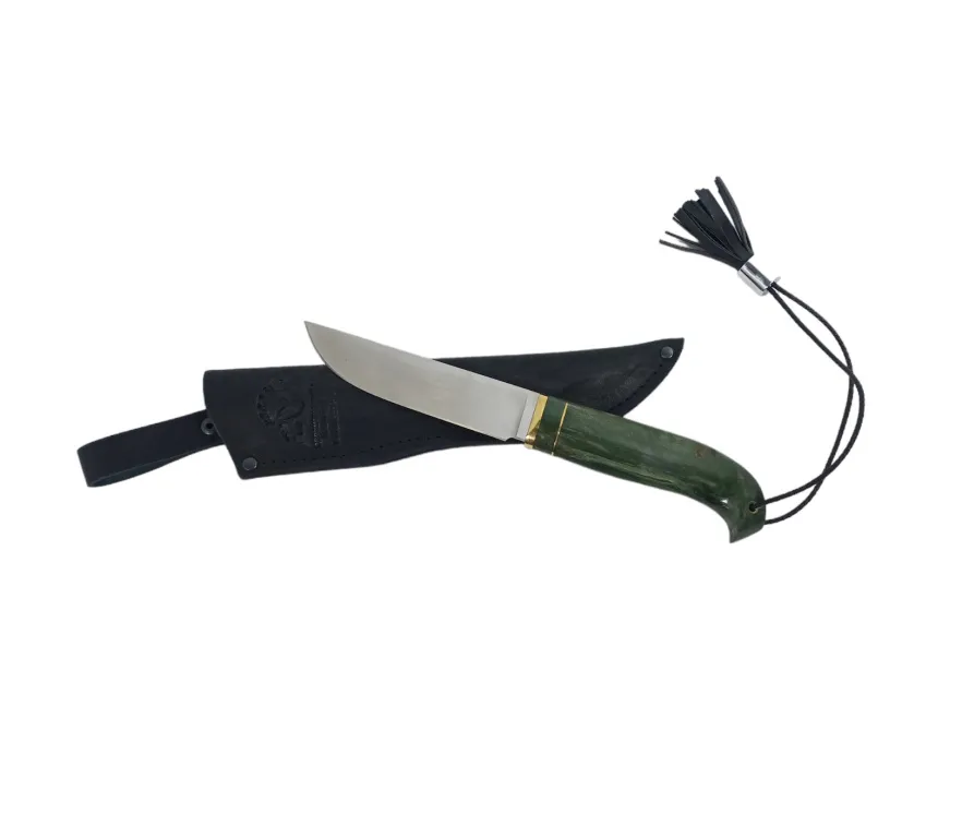Испытанный образец ножа из стали Х12МФ «Крот-2»,с рукоятью из дерева карельская береза и отверстием под темляк, не относится к холодному оружию и является разделочным ножом. Соответствуют требованиям ГОСТ Р 51644-2000 «Ножи разделочные и шкуросъёмные». Нож комплектуется ножнами из натуральной кожи и сертификатом. Нож имеет бритвенную заточку.