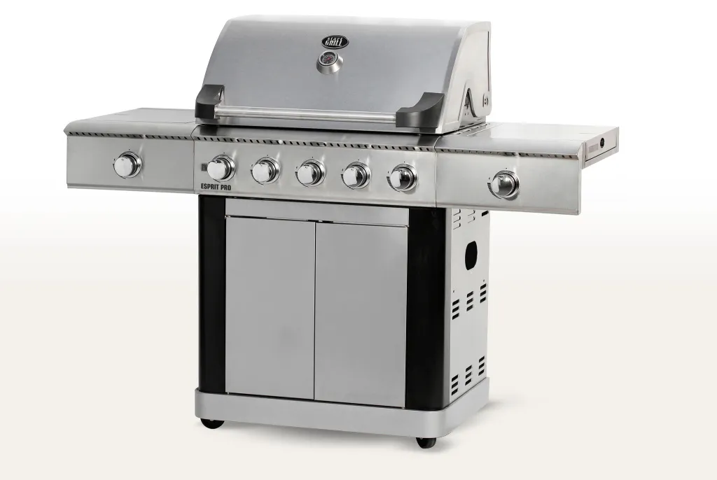 Ярким преимуществом модели Esprit Pro является наличие 5 горелок, которые обеспечивают равномерное распределение тепла. Инфракрасная ветроустойчивая левая боковая горелка разогревается до 800°C и гарантирует идеальную прожарку мяса в любую погоду. Правая мощная боковая горелка прекрасно подойдет для приготовления фирменных соусов. Гриль укомплектован чугунными решетками для приготовления, чугунной планчей и решеткой для подогрева.