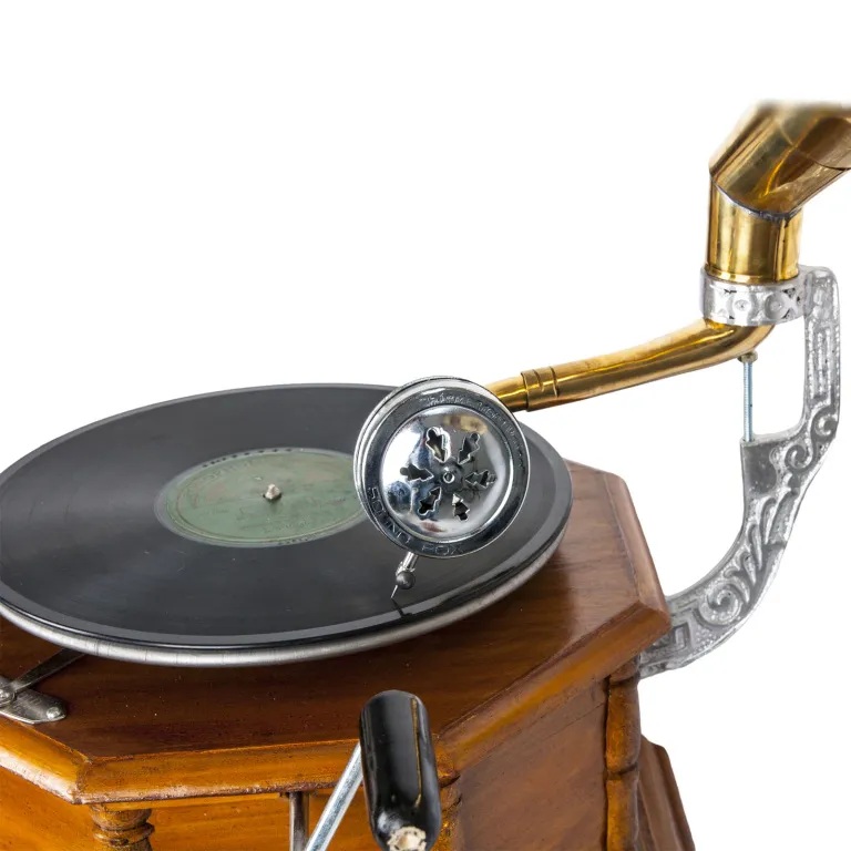 Граммофон механический с трубой в рабочем состоянии. Современный. Деревянный восьмиугольный корпус из темного дерева с латунной трубой.