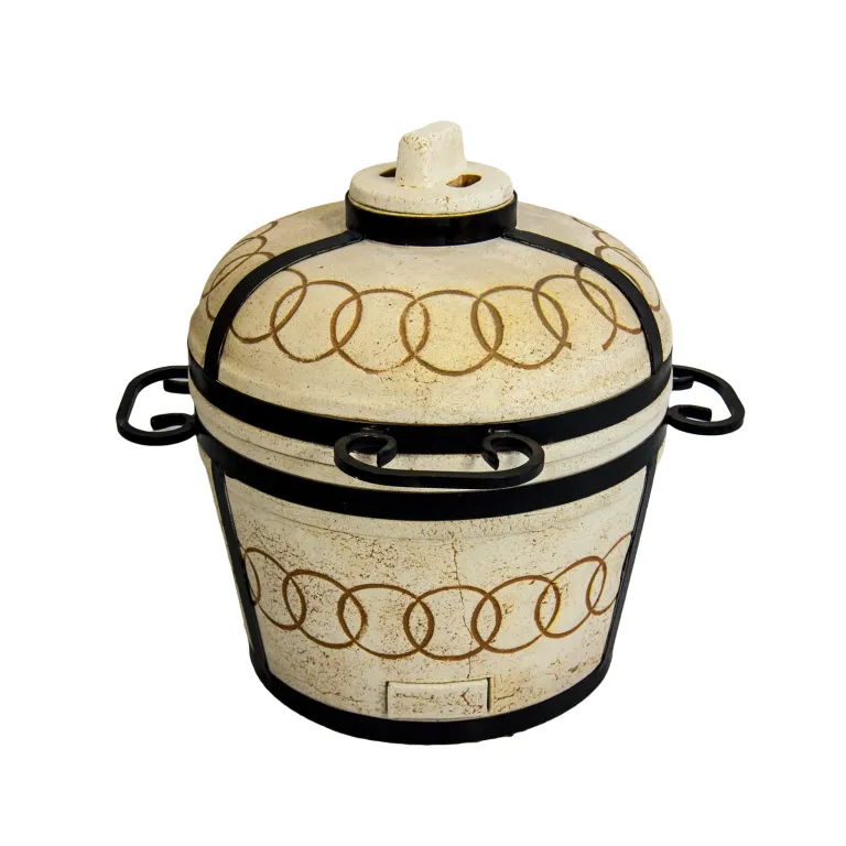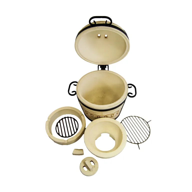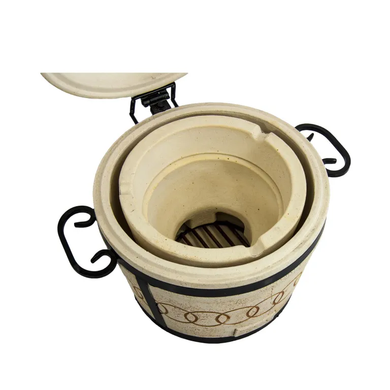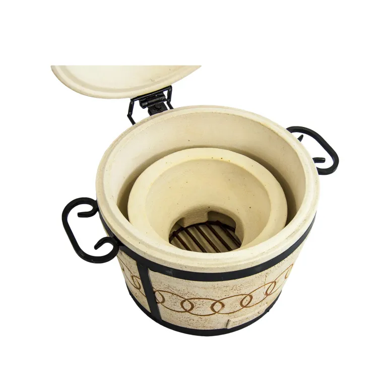 Приготовление шашлыка происходит не только от жара углей, но и за счет мощной теплоотдачи керамических дна и стен гриля-барбекю. Внешняя колба барбекю соединена с большой крышкой на специальном механизме, удерживающем последнюю от опрокидывания. Решетка гриля выполнена из пищевой нержавеющей стали марки (AISI 304/430). Материал, из которого изготовлен корпус барбекю – шамотная огнеупорная глина, очень долговечен и прекрасно держит тепло.