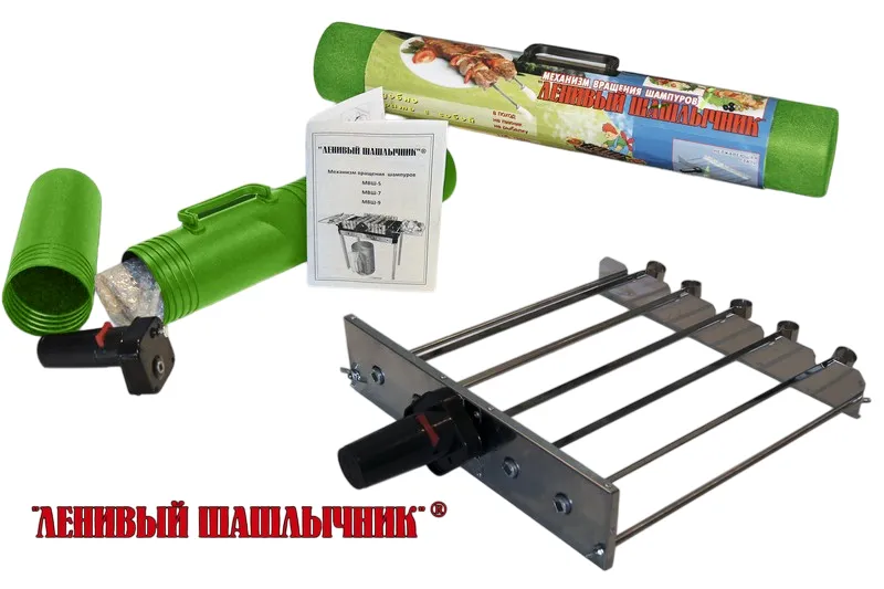 Механизм Вращения Шампуров сделан из нержавеющей стали и представляет собой насадку, которую можно ставить на мангал, гриль, барбекю, кирпичи. Механизм легко собирается и разбирается, и упаковывается в пластиковый тубус или в специальный чехол (по Вашему выбору).