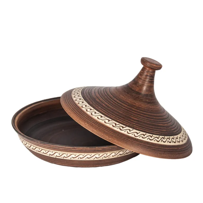 Марокканская посуда тажин также используется для приготовления блюд из мяса, овощей, рыбы и блюд из других ингредиентов. Тажин состоит из чаши и конусовидного колпака, который устанавливается на чашу. Силуэт тажина напоминает тандыры, знаменитые восточные печи. В процессе приготовления влага из продуктов испаряется и конденсируется на стенках крышки, после чего стекает вниз. Таким образом сохраняется сок продуктов и аромат специй, поэтому блюда получаются сочными, нежными и невероятно ароматными.