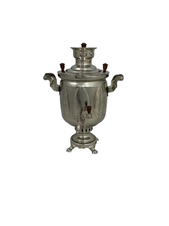 Цена на товар может измениться после поступления товара. Точную цену уточняйте у нашего менеджера. Телефон: 8 (812) 336-25-25Самовар Банка, листья, 5 литров, завод Штамп Тула, 80-е годы ХХ века, не использовался, никель, белый, труба 66 мм